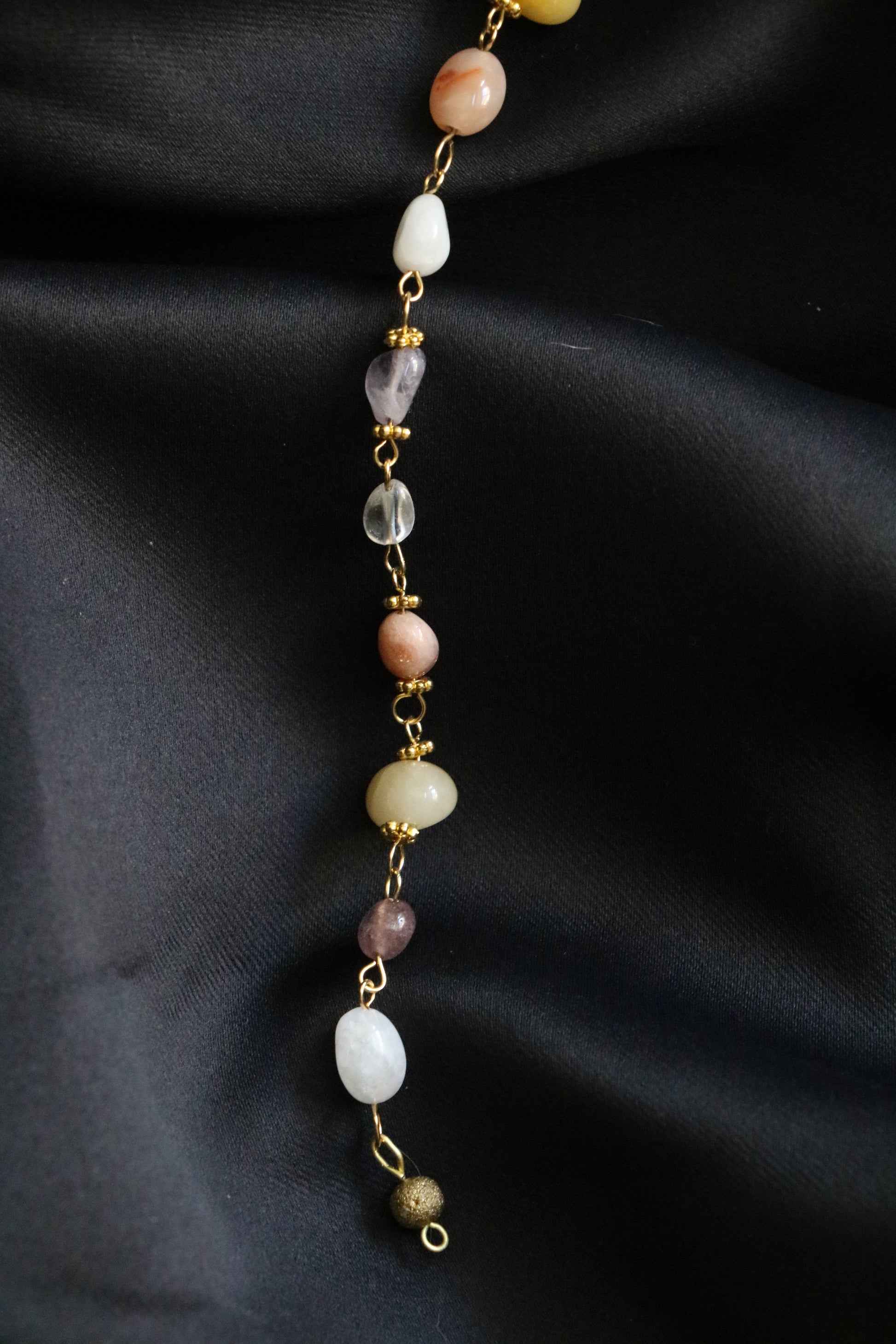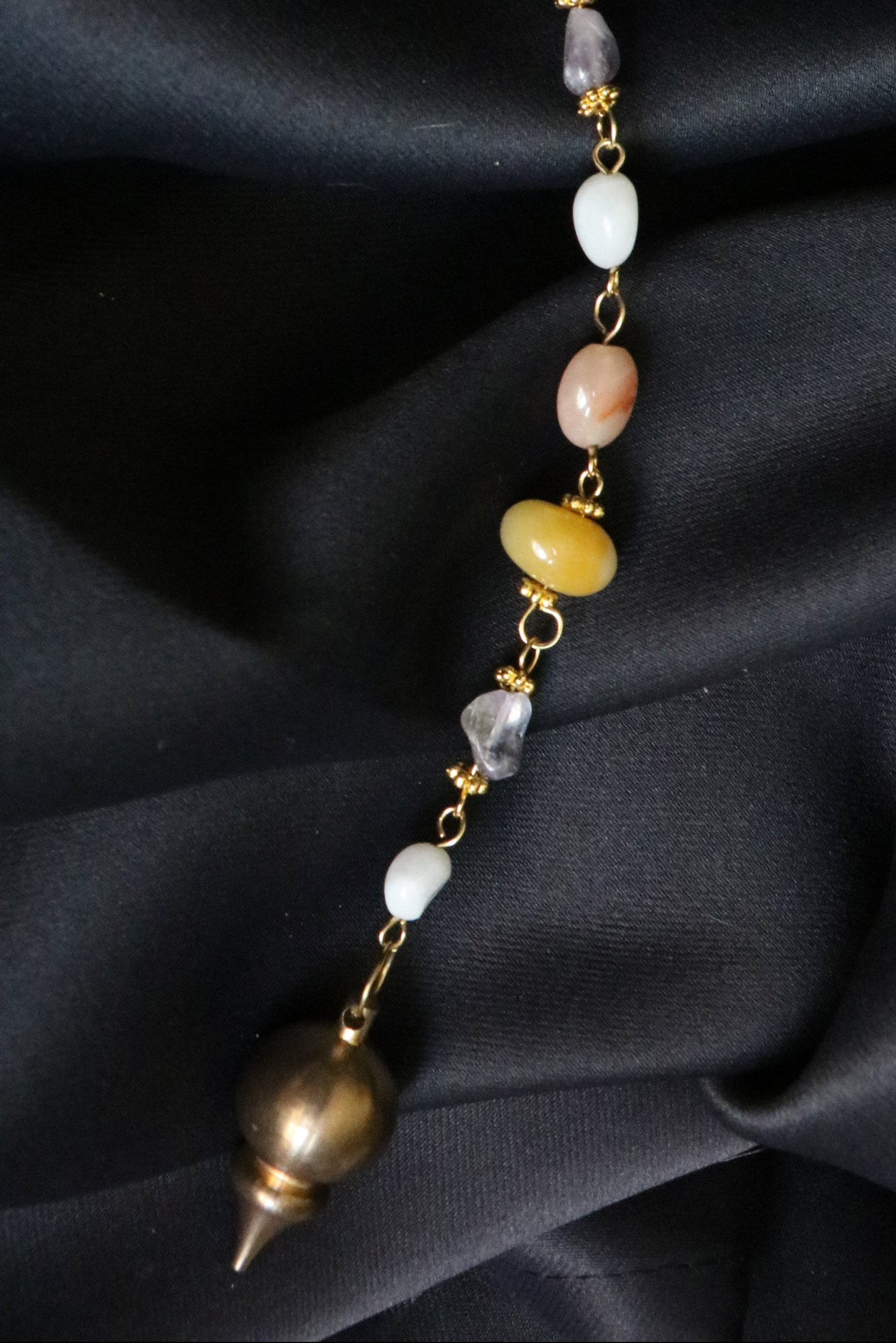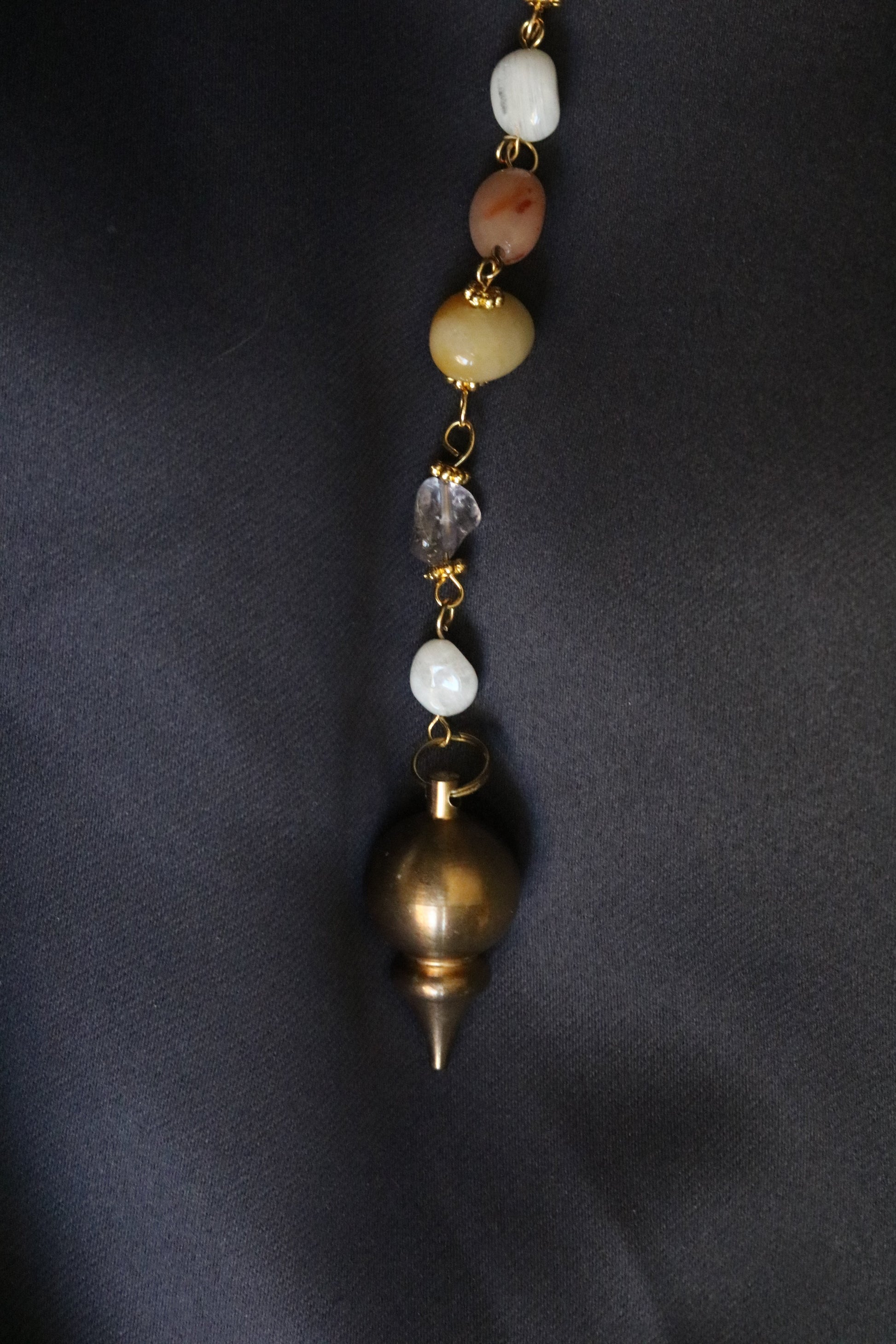 This pendulum features a chain made entirely of beads resembling stones and crystals. The solid brass pendant point has a double bulb design and a brushed gold appearance. The gold elements create an elevated and beautiful tool for the craft. Note: Each pendulum is hand-made and will include a different variety of bead choices.